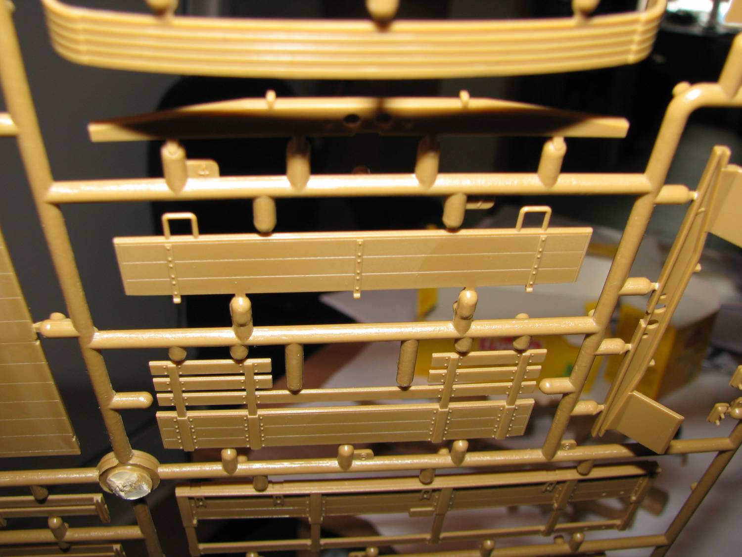 грязевые щитки - в простонародье брызговики: Я понимаю что уважающие себя моделисты будут докупать "Травло", и имитировать из свинцовой фольги резиновую часть. А тогда кого уважает производитель: вообще-то хоть с одной стороны но выштамповку-то надо, хотя я кажется догадался почему они гладкие, их толщина равна толщине борта, и производитель хотел написать в инструкции. "Далее доработать деталь самостоятельно", но забыл. Конечно в таком случае, какой рельеф, он все равно сточится или срежется.