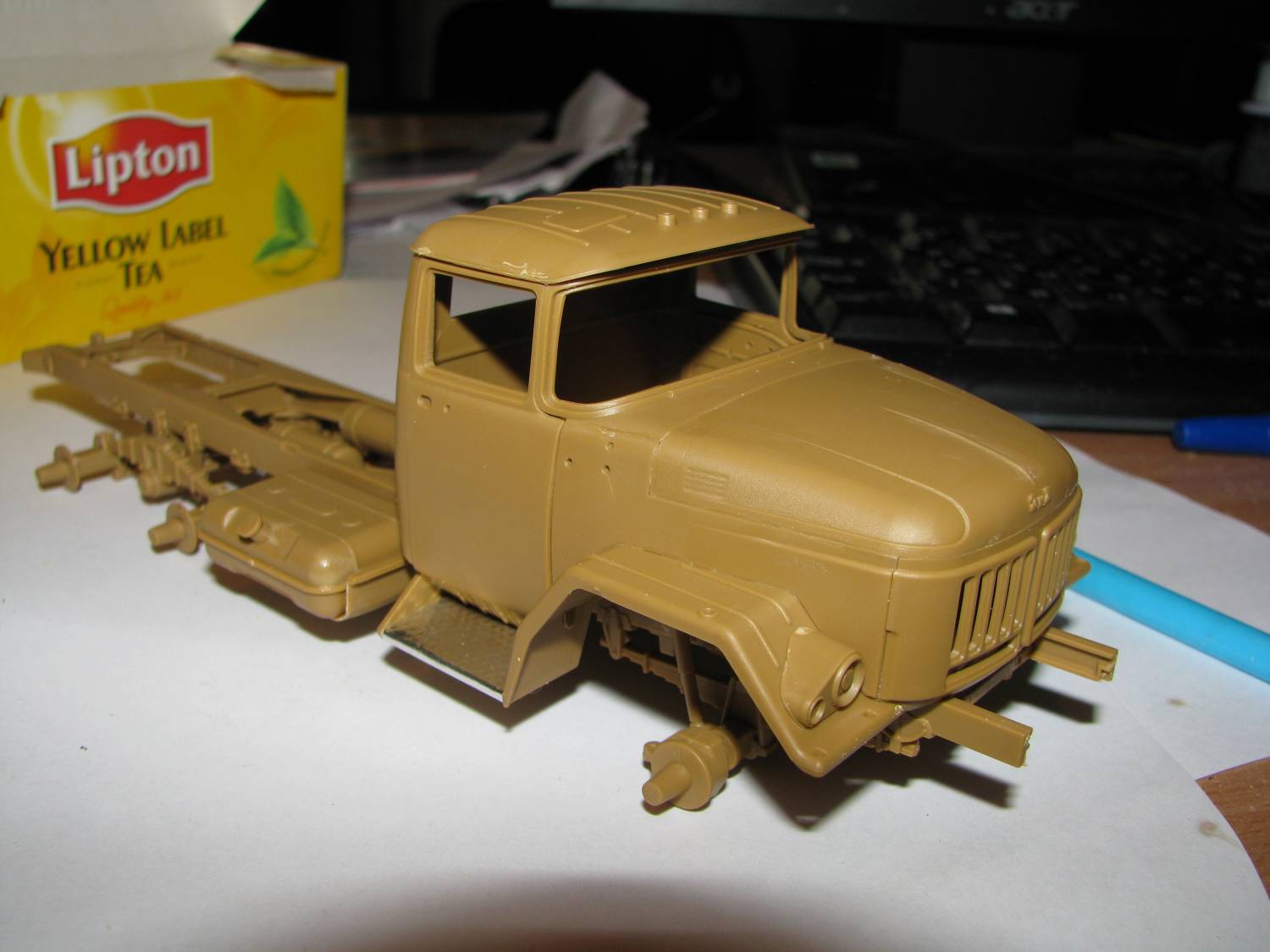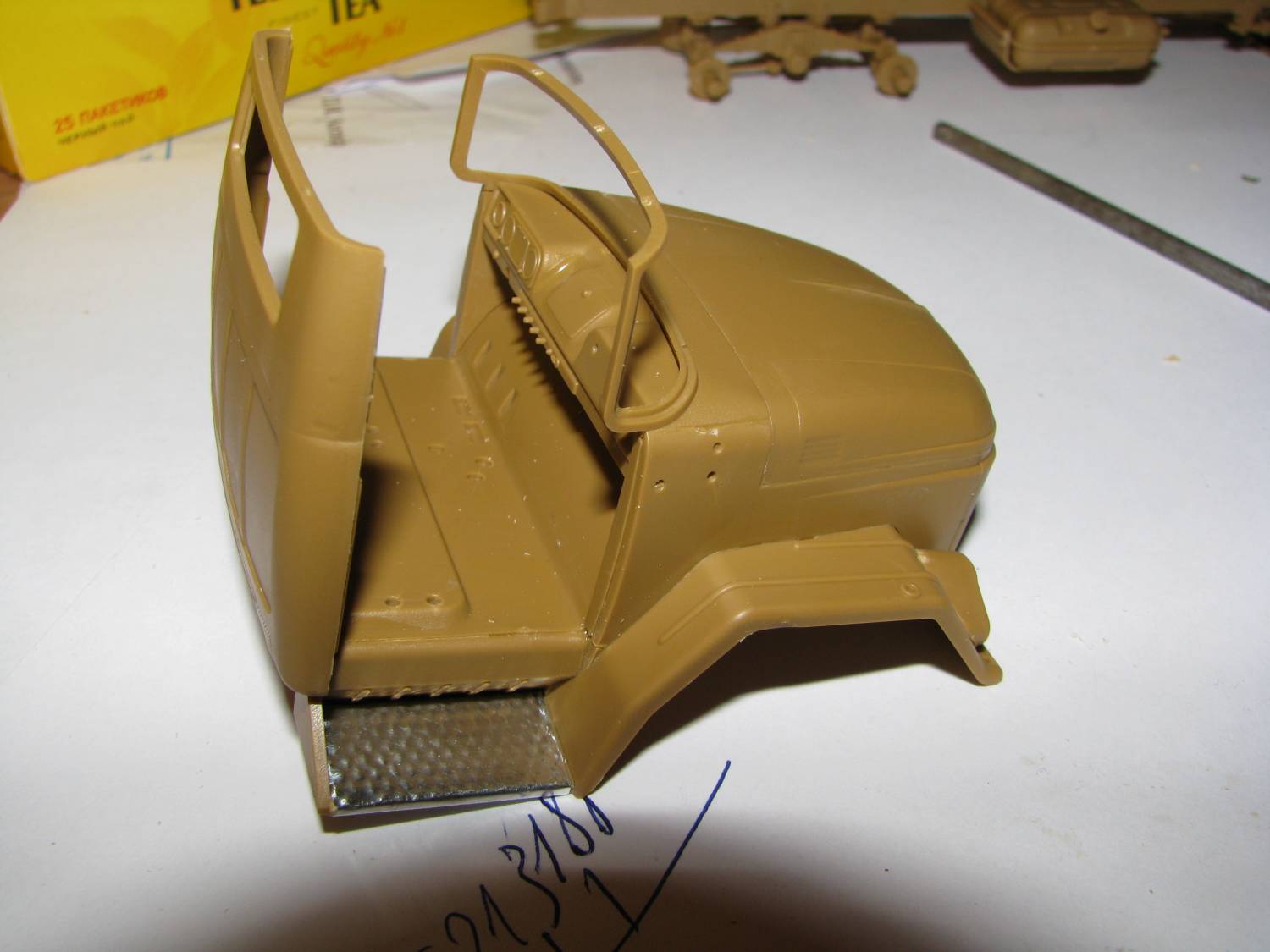 | теперь кабина: про геометрию не скажу но стыкуемость просто отличная. Несмотря насвоеобразное членение, такое ощущение, что, стыков кузовных панелей не хватает. Ложкой дегтя стали, питатели детали крыши. Которые и не на желобке, и не в удобном месте поэтому и пилить и шлифовать кое где придется. Производитель перемудрил с устройством сидений,и установил, что водительское, что пассажирское сиденье "на полозки", слишком крупно и "неправдушно" показаны педали, вообще пол в передней части кабины не на своем месте, но надеюсь, что не слишком будет видно: