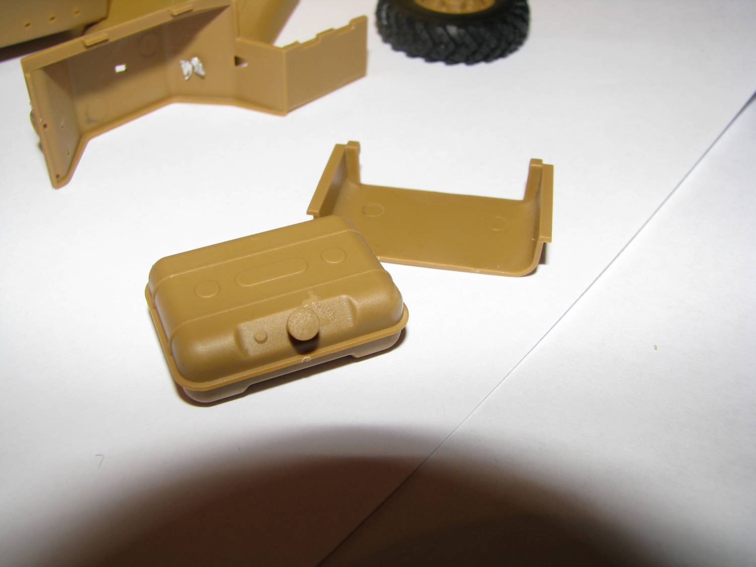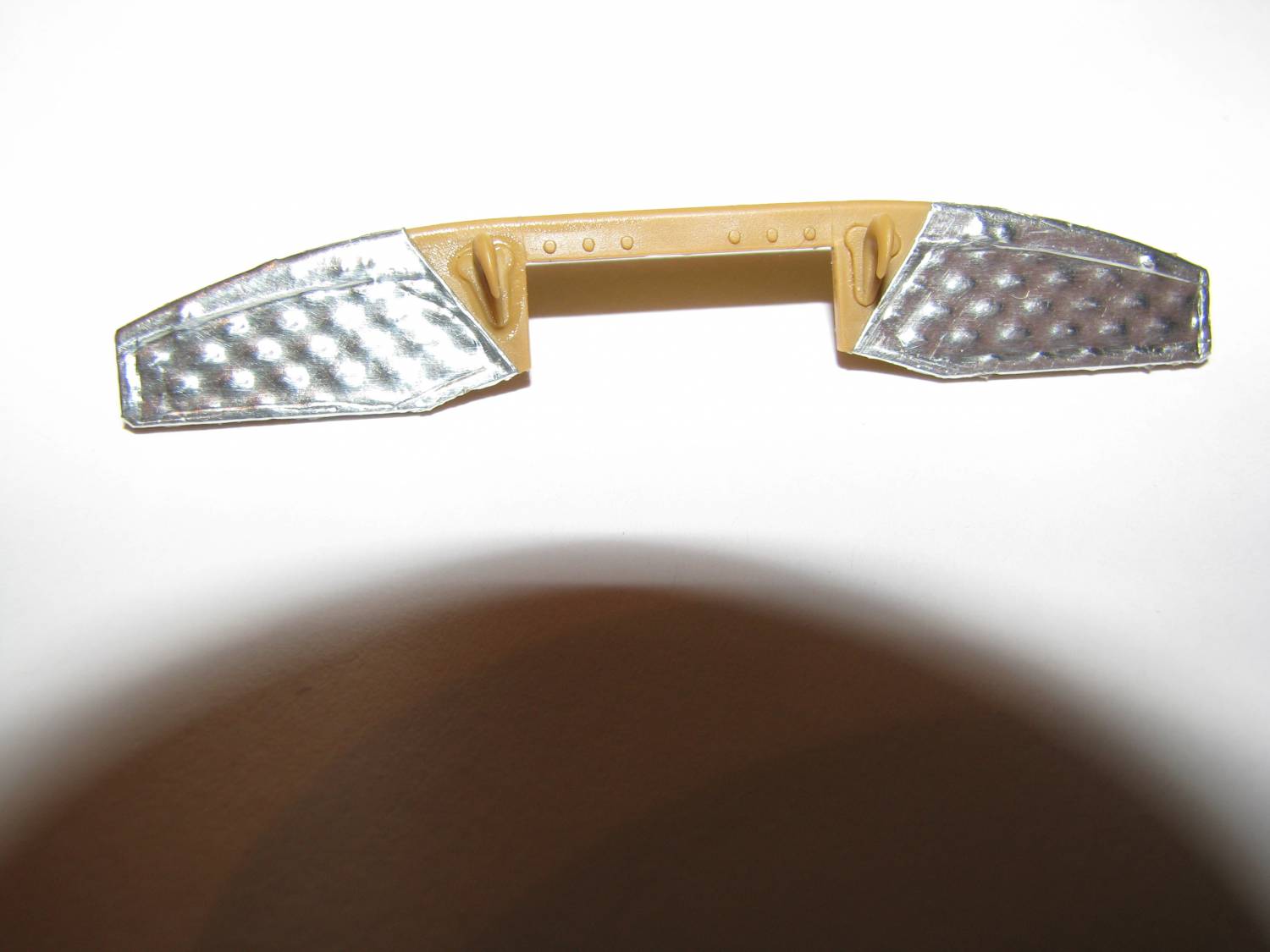 на фото уже с "Эрзац-решением" заклеены самоклящейся фольгой, для скрадывания текстуры. При этом сделать буксирные крюки для вклейки заподлицо без малейшей имитации головок болтов. Ну "други мои-и-и", это после того, что на модели "скаута" от "Итальери", почти сорокалетней давности, этот элемент кажется более достойным.