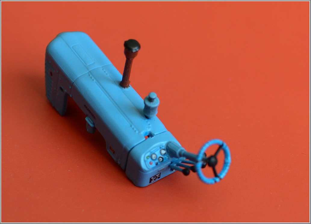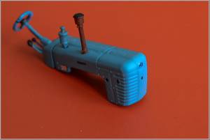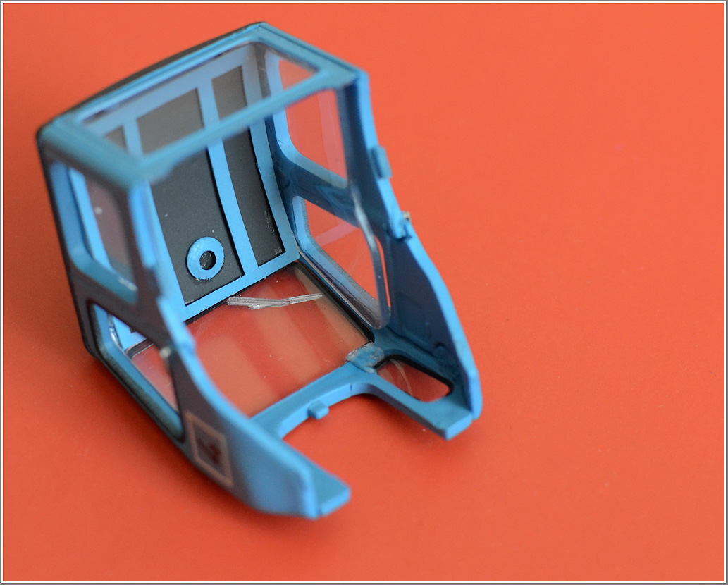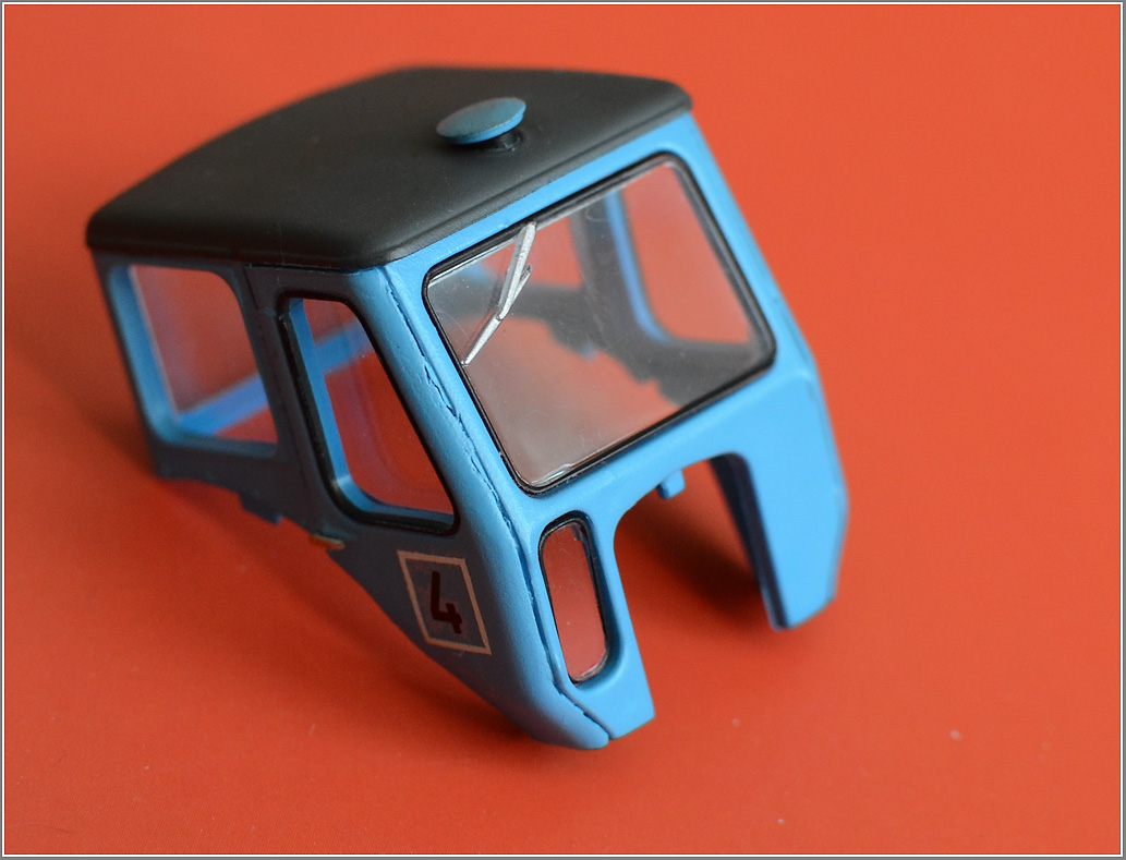 | Двигаем дальше. Кабина. Кабину, при желании, народ даже делает открытой - в смысле, с открытыми дверями. Всё, что для этого нужно - аккуратно отделить двери, и приклеить, либо на петельки - в открытом состоянии. При условии, что вам есть, что показать внутри оной кабины. Собственно по кабине - попробовал отломать двери - не получилось, больно крепкий вариант приклейки у меня оказался. Поэтому, ограничился тем, что: - сделал снуля колпак вентиляции, срезал старый, и вклеил новый из круглого литника и полсверической шайбы. - перекрасил сверху потолок кабины - это был серый, темно-серый дермантин на каркасе. - сделал изнутри имитацию каркаса и дермантина, а так же вентиляционное отверстие в нём - сделал ручки дверные - проволока, сплющенная и обточенная до масштабности - наклеил на борта (дверцы) четвертый номер - ну много тракторов было в хозяйстве :-)