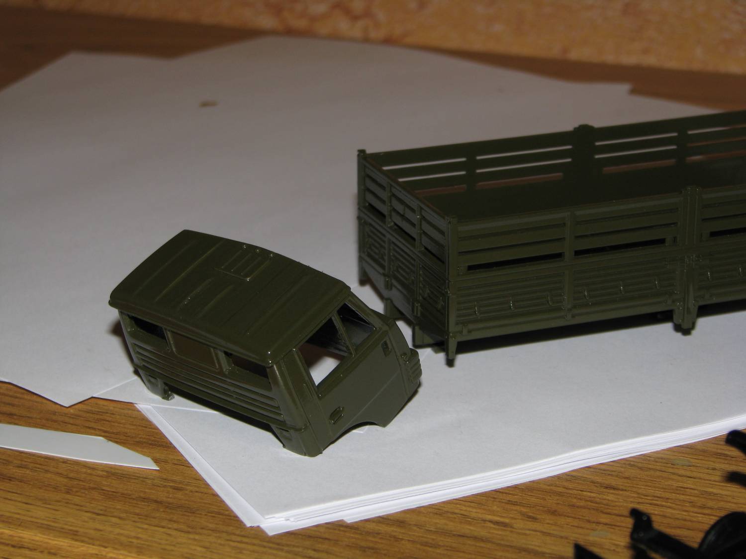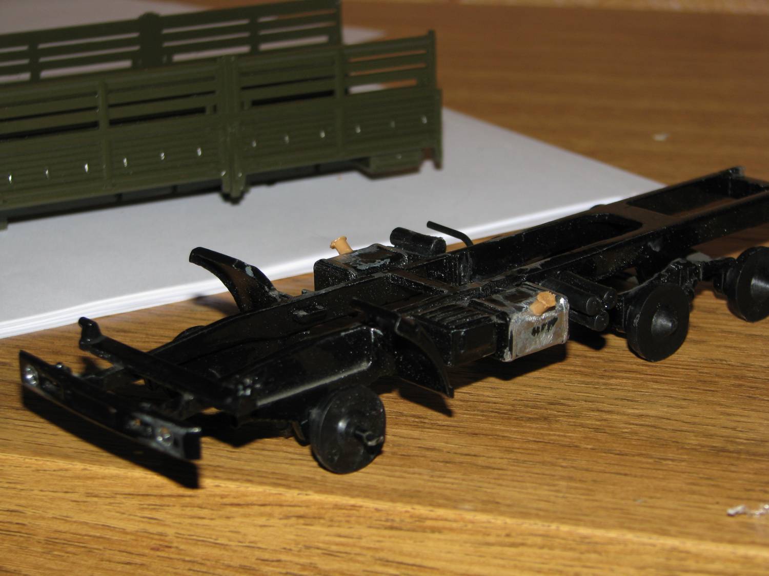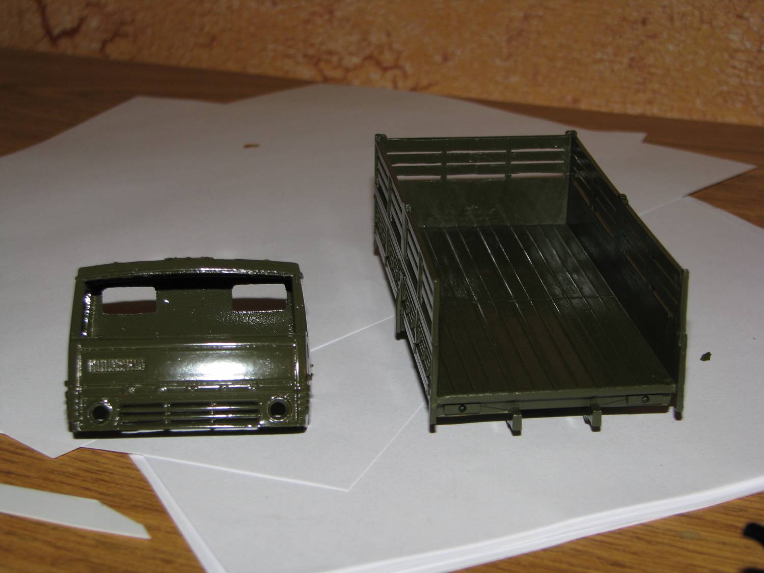 Непосредственно к объекту моделирования: было решено определить порядок работ. По плану: 1. Перекрасить, кабину, кузов, раму. 2. Создать на крыше кабины выштамповки. 3. Окрасить сиденья, (салона на модели почти не видно, а жаль.) 4. Добавить выштамповки на фартуках подножек. 5. Изготовить!!! Подножки (все дело в том, что либо по недоразумению, либо по технологическим причинам, подножки кабины были буквально «только намечены»). 6. Привести в порядок светотехнику ( с самого начала было решено оснастить модель «СМУшками», (светомаскировочными устройствами, на фарах) «нормальными «подфарниками»»). 7. Доработать (по минимуму) кузов и придумать груз в него. 8. С помощью окраски, тонирования, придать машине нужный облик.