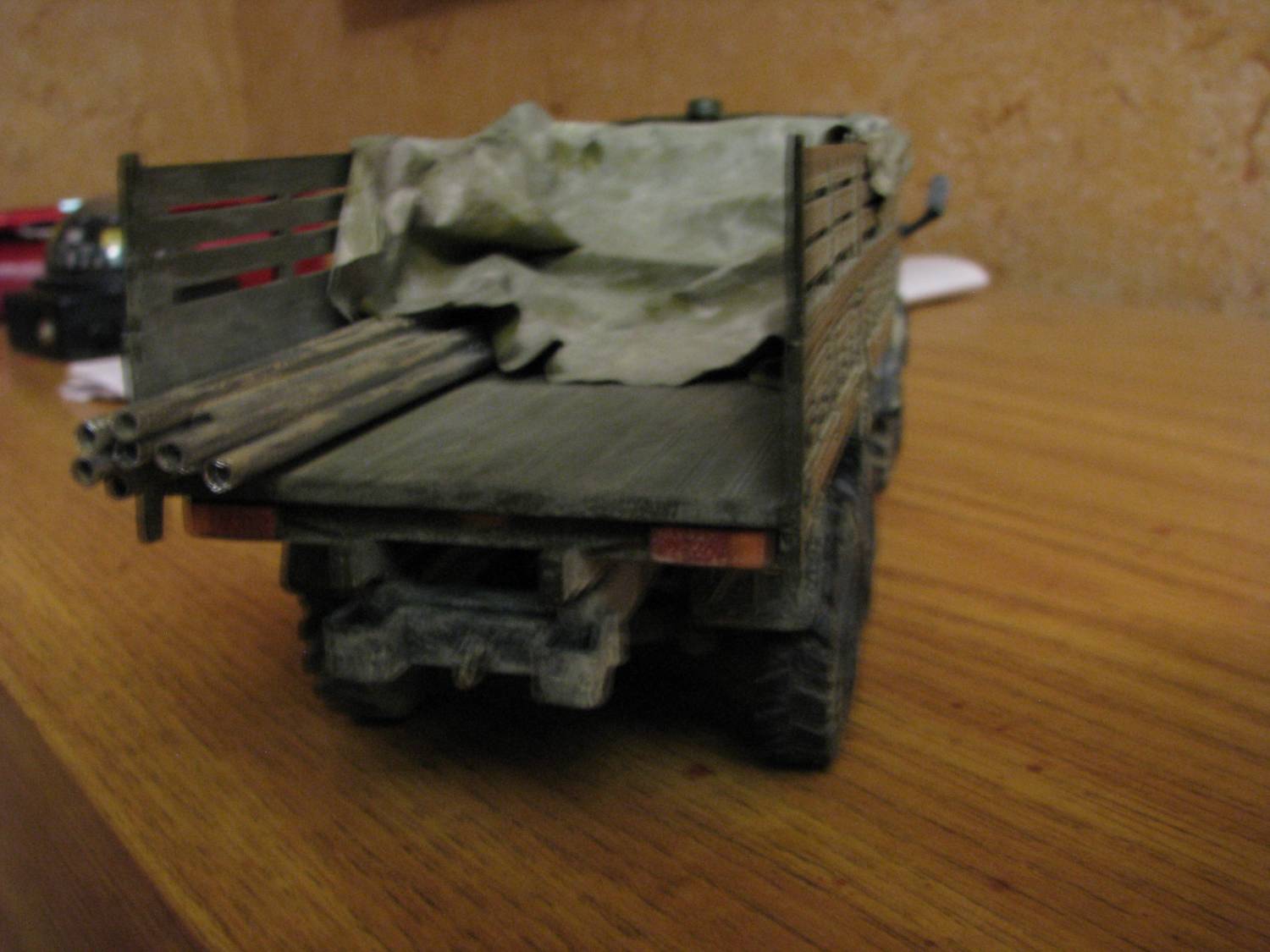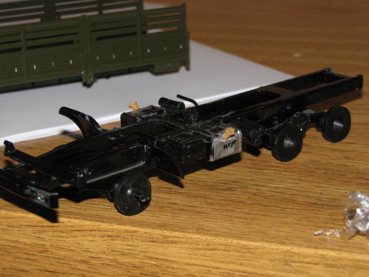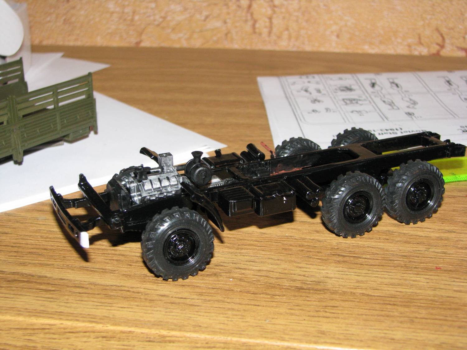 Непосредственно к объекту моделирования: было решено определить порядок работ. По плану: 1. Перекрасить, кабину, кузов, раму. 2. Создать на крыше кабины выштамповки. 3. Окрасить сиденья, (салона на модели почти не видно, а жаль.) 4. Добавить выштамповки на фартуках подножек. 5. Изготовить!!! Подножки (все дело в том, что либо по недоразумению, либо по технологическим причинам, подножки кабины были буквально «только намечены»). 6. Привести в порядок светотехнику ( с самого начала было решено оснастить модель «СМУшками», (светомаскировочными устройствами, на фарах) «нормальными «подфарниками»»). 7. Доработать (по минимуму) кузов и придумать груз в него. 8. С помощью окраски, тонирования, придать машине нужный облик.