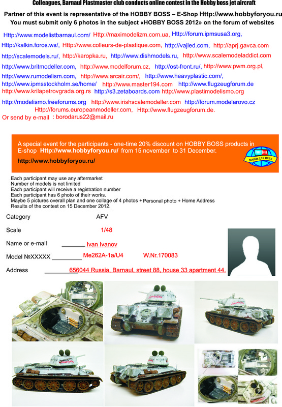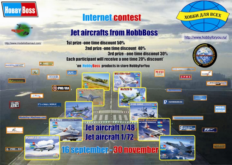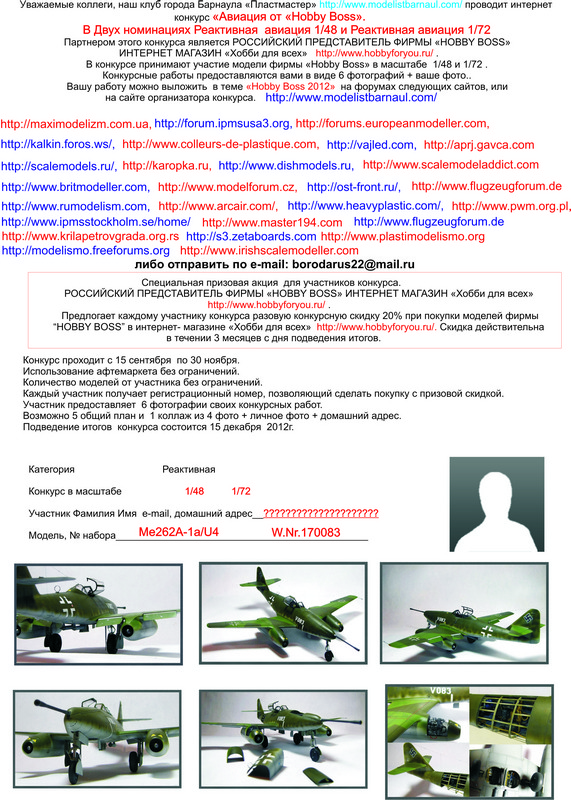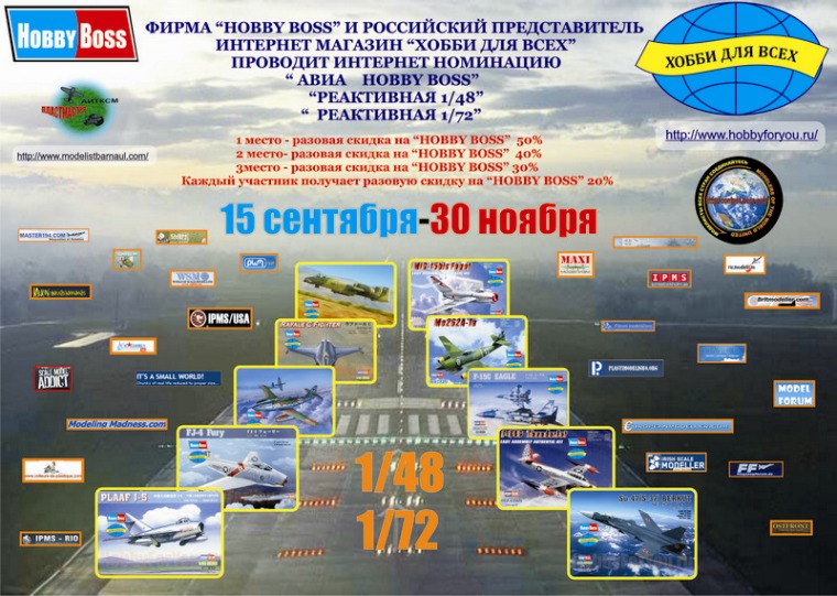 | So ladies and gentlemen, start phase II online competition "HOBBY BOSS 2012." Remind you about the upcoming nominations: "Jet Aircraft 1/48" "Jet Aircraft 1/72", "AFV 1/48." Dates 15 September-30 November-2012. Those wishing to participate should send 6 pictures of the finished model (suggested by colleagues from Ukraine is allowed five overall plan one collage of four photos, 1 personal photo model, catalog number, your home address (the award is necessary to send to you). His work can be sent to e-mail borodarus22@mail.ru . Let's go. Итак уважаемые коллеги, как наши так и зарубежные, начинается II этап интернет конкурса "HOBBY BOSS 2012". Напоминаю о предстоящих номинациях : "Реактивная авиация 1/48" "Реактивная авиация 1/72" " Бронетехника 1/48". Сроки проведения 15 сентября-30 ноября 2012года. Желающим принять участие, надо выслать 6 фотографий готовой модели ( по предложению коллег из Украины разрешается 5 общий план+1 коллаж из 4 фотографий,+1 личное фото + каталожный № модели+ Свой домашний адрес ( награду то надо вам выслать). Свои работы можно высылать на почту borodarus22@mail.ru . Итак начинаем.