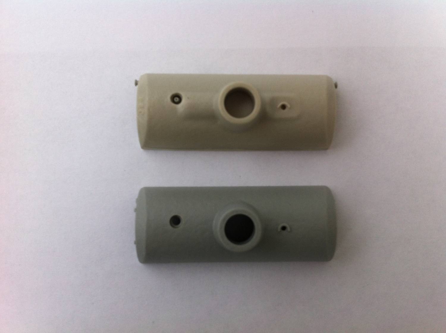| Далее на очереди была маска орудия.Загвоздка оказалась в том,что на данном борту стояла нестандартная маска модификации G,была маска с наплывами(усиленная) Поскольку такой в наборе не было,заменять маску было обязательно,поскольку это критичное отличие моего прототипаза от стандартной Г-шки заказывать пришлось смолу,к моей радости ее выпускает Panzer Art,маска была заказана,смола отличного качества,за иключением отломанного куска смолы,который был нарощен двухкомпонентной шпаклей А вот сравнение Сверху правильная Panzer Art снизу Дурогон)